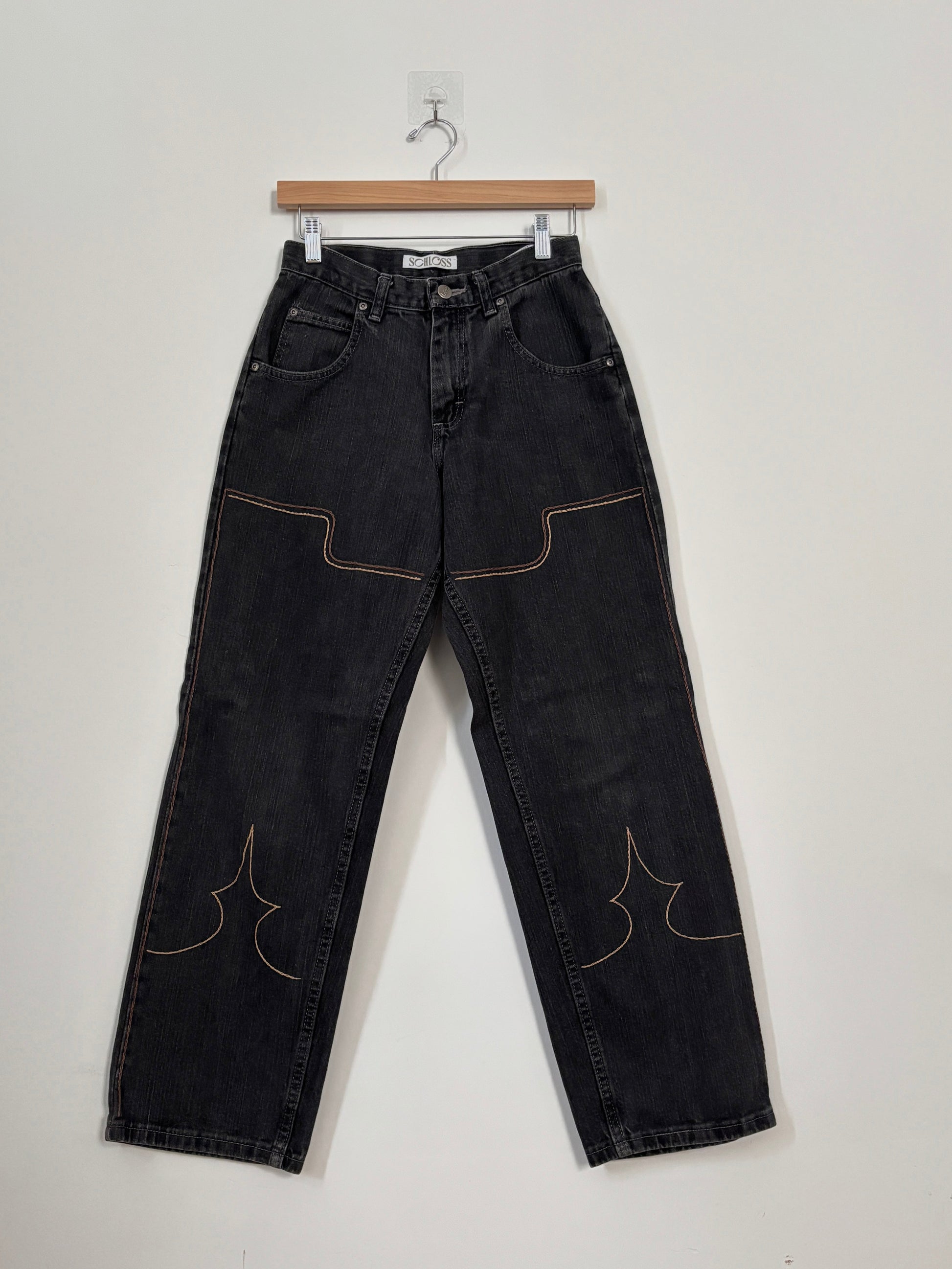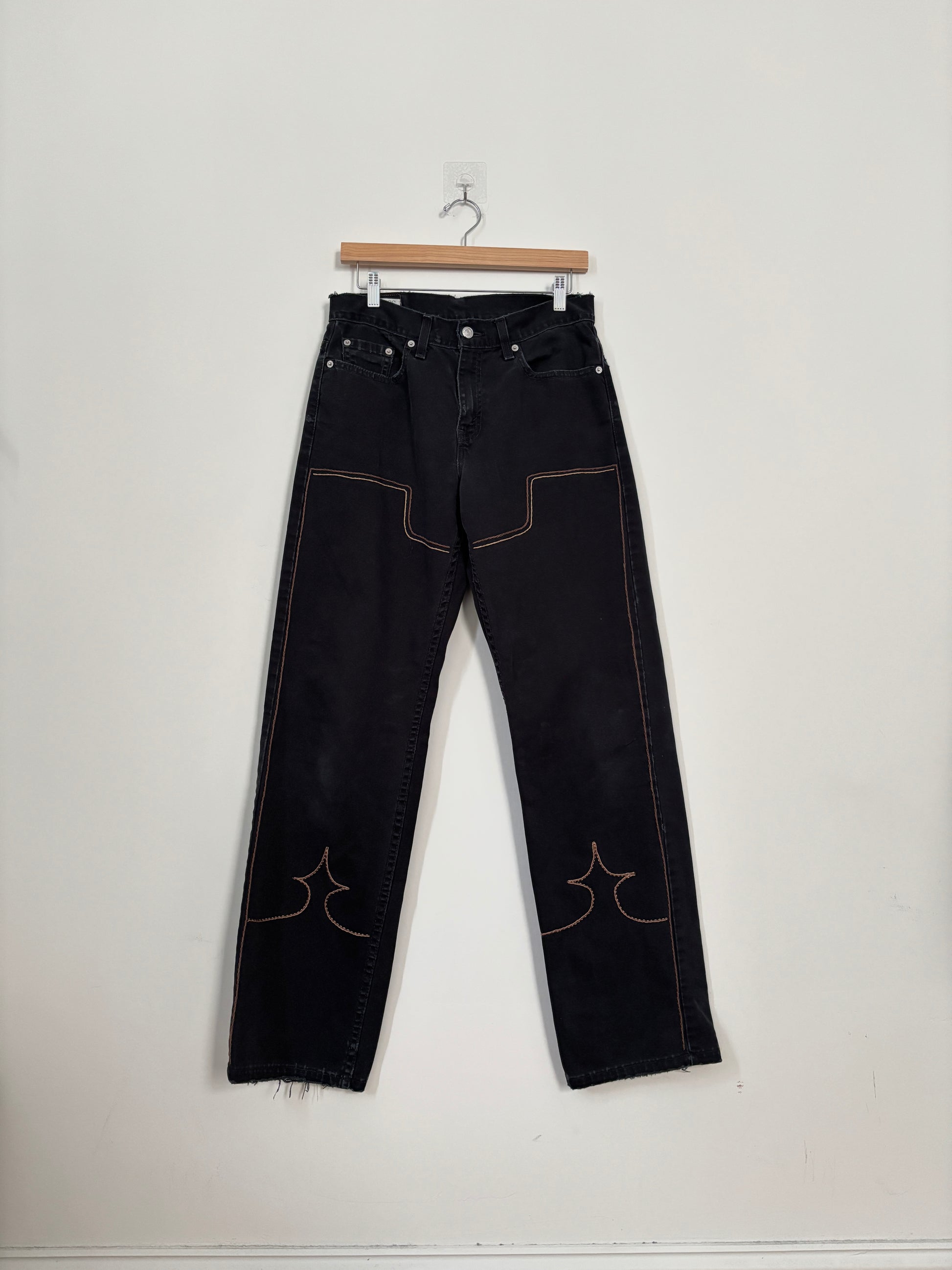 Find out how the west was won in these handstitched vintage Calvin Klein white jeans. Tan and brown chap embroidery adorns these upcycled vintage 90’s Calvins.