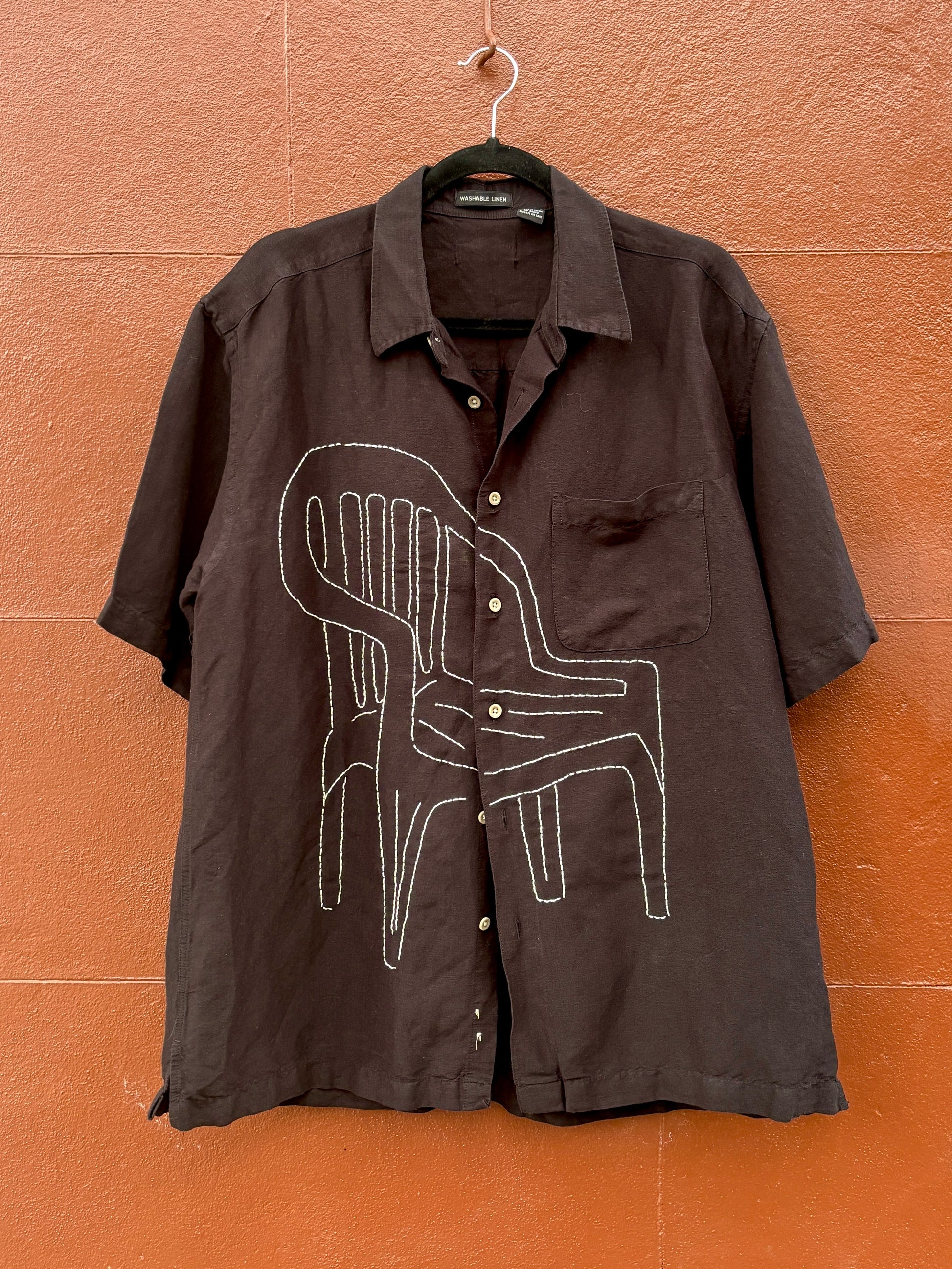 Take a seat in the Carioca Shirt. Hand embroidered with summer iconography, the Monobloc chair, the Carioca Shirt insinuates beers on the sidewalk, the sun on your skin, and carefree days ahead.
