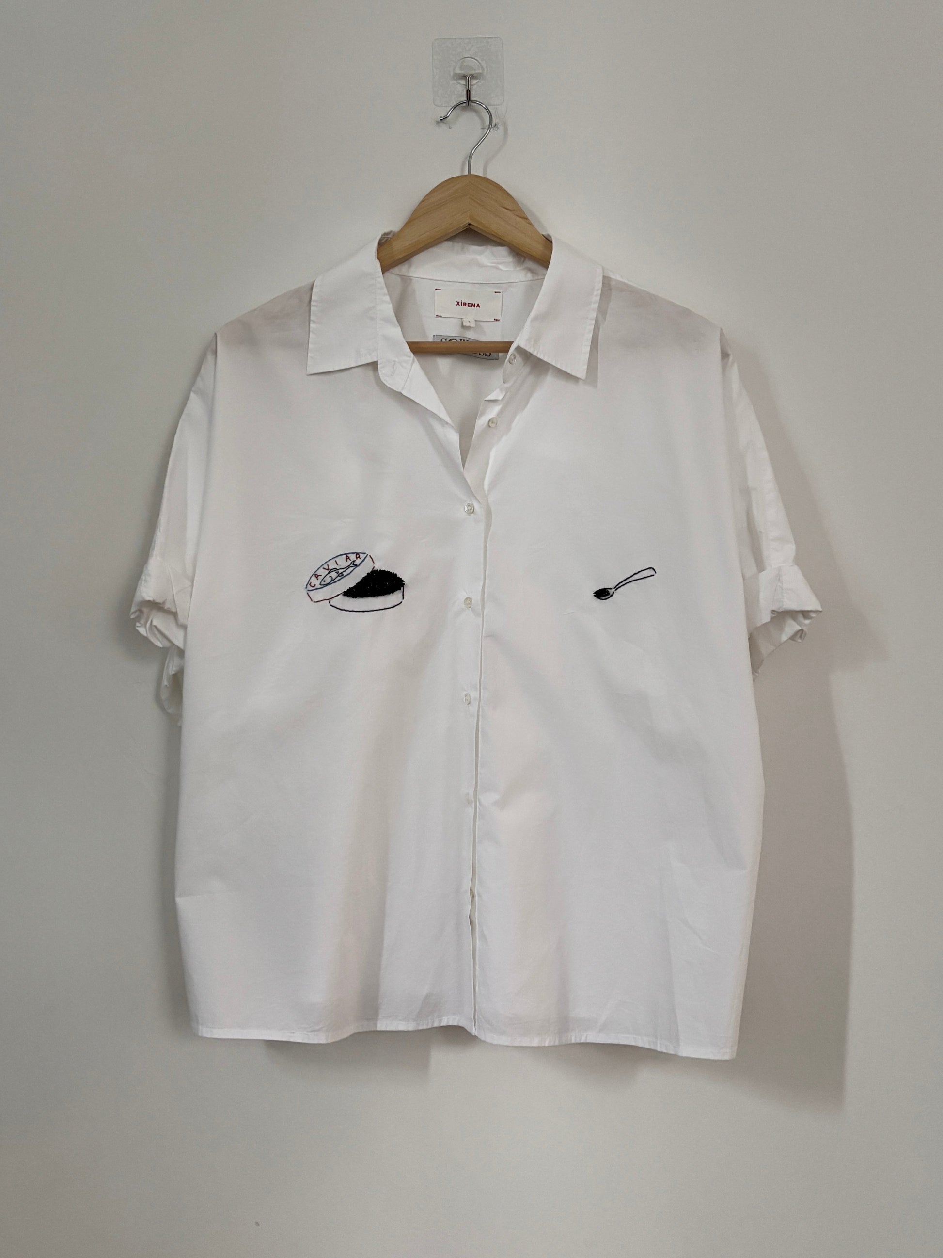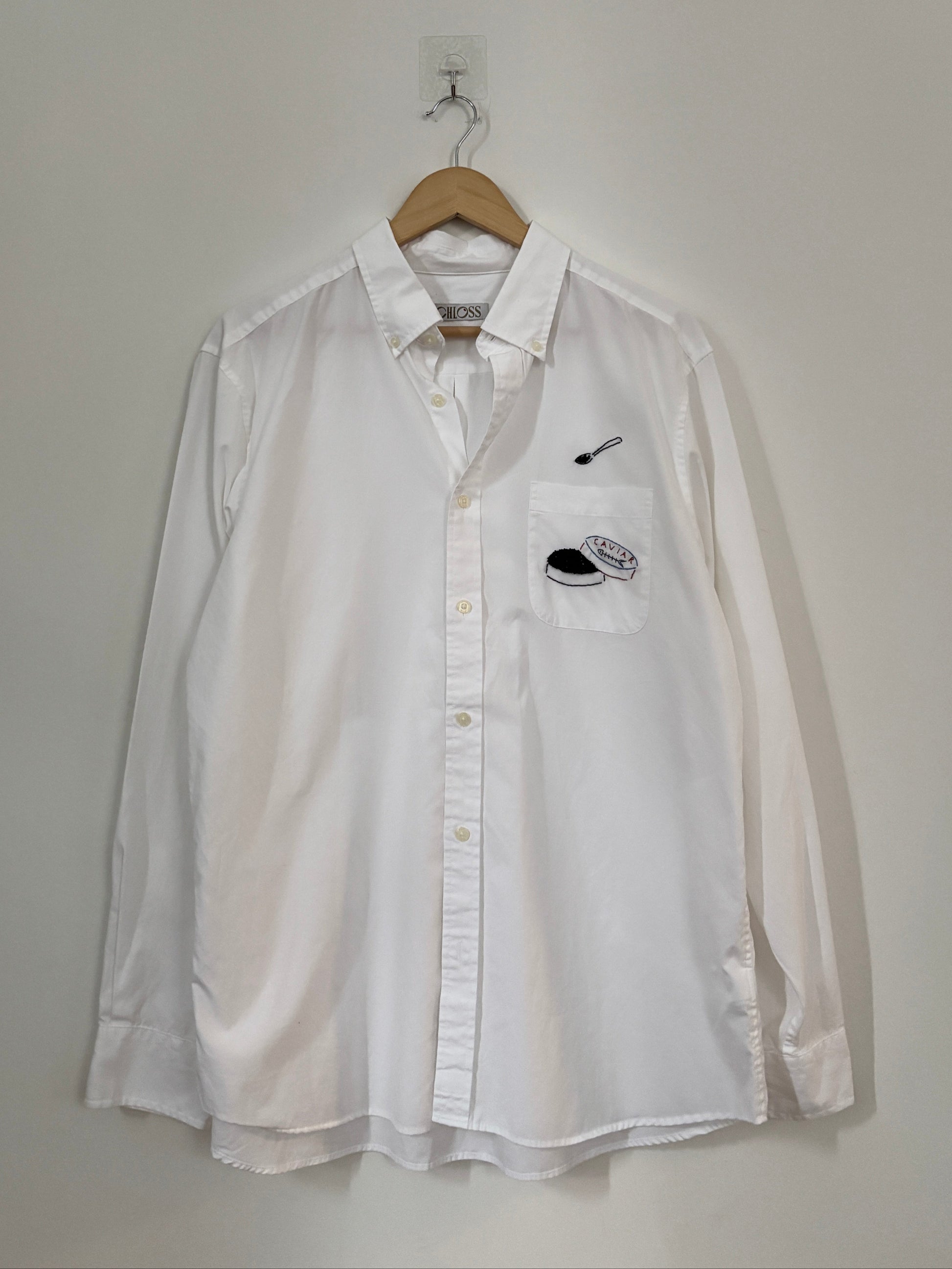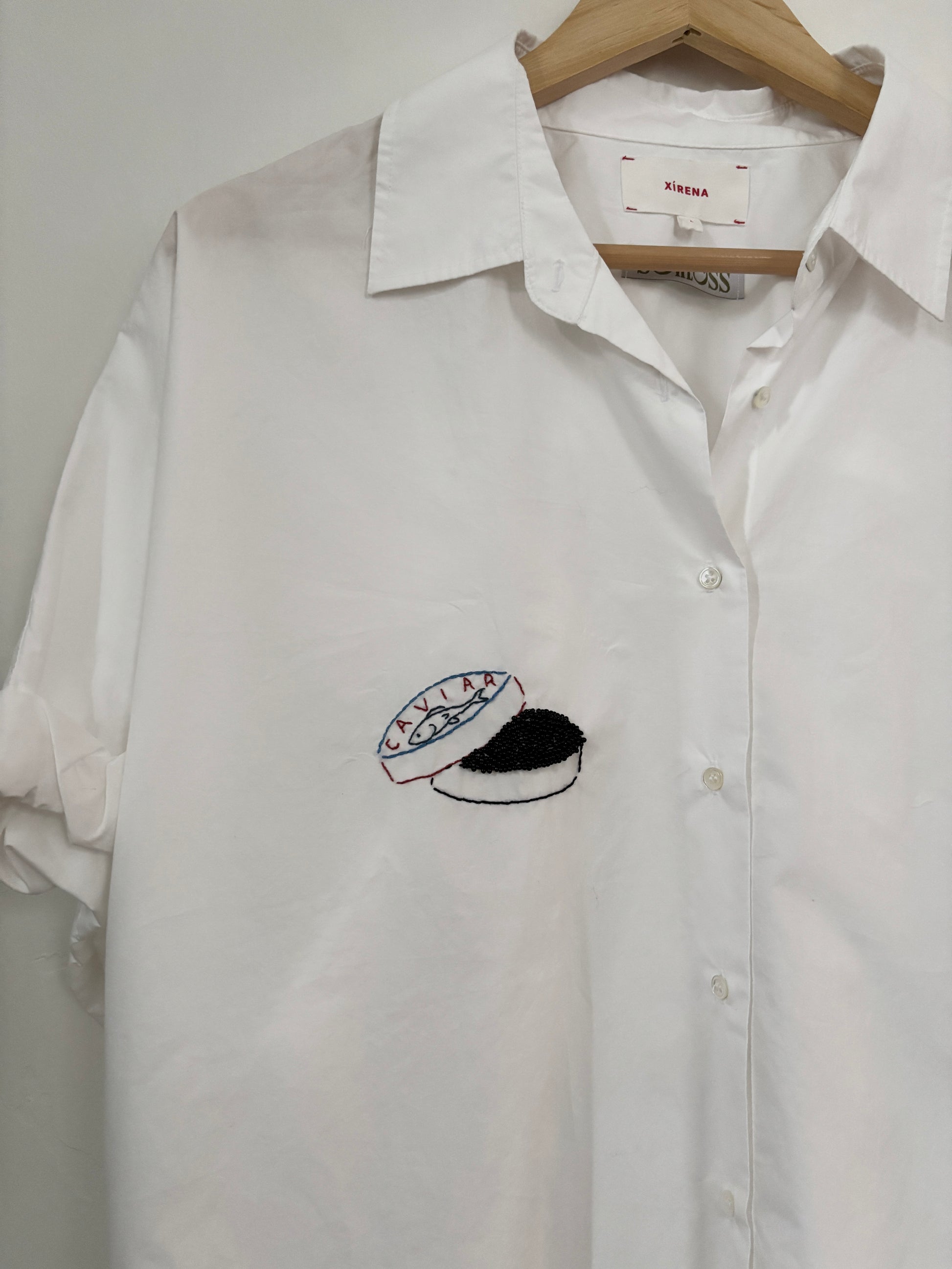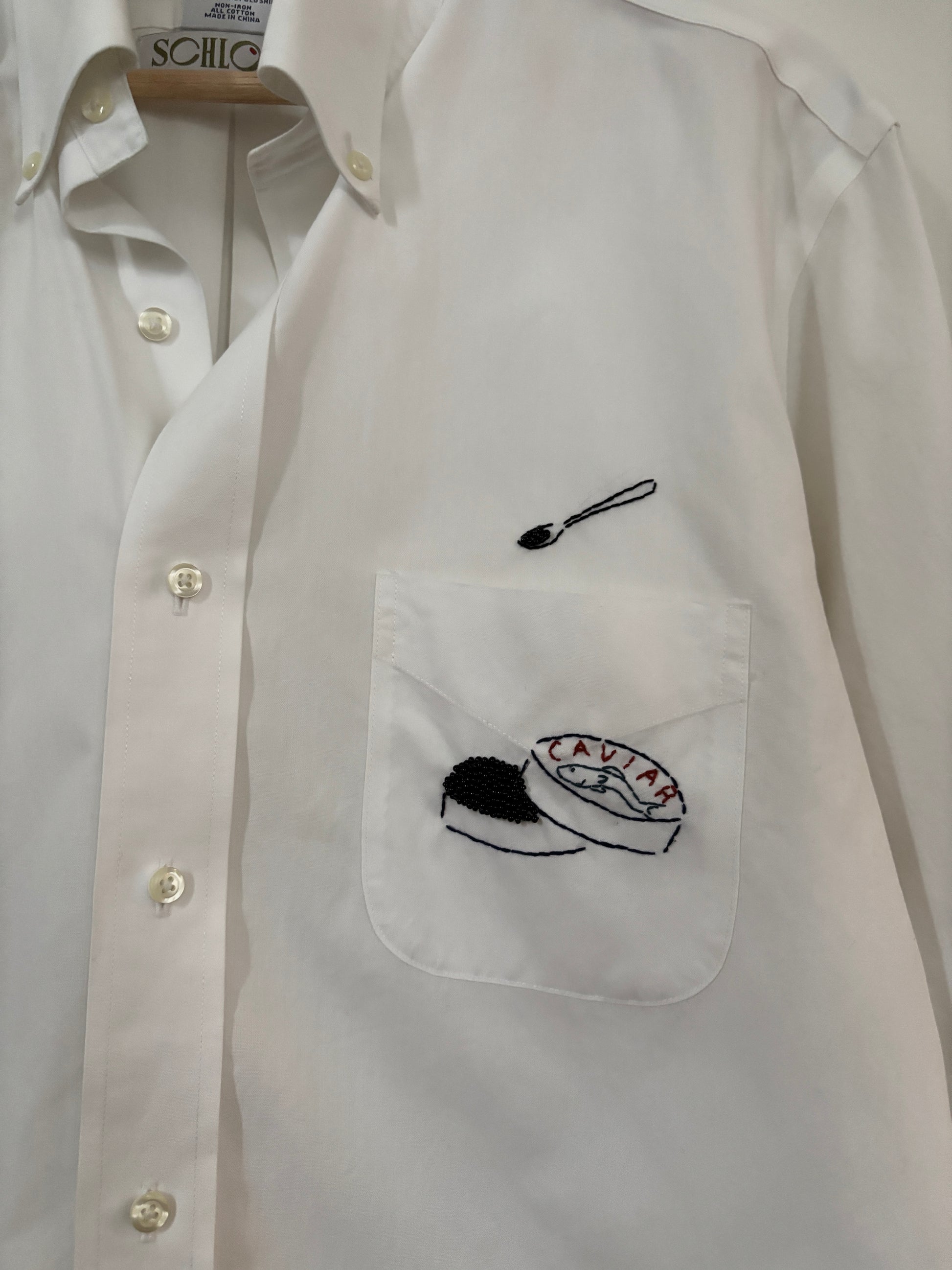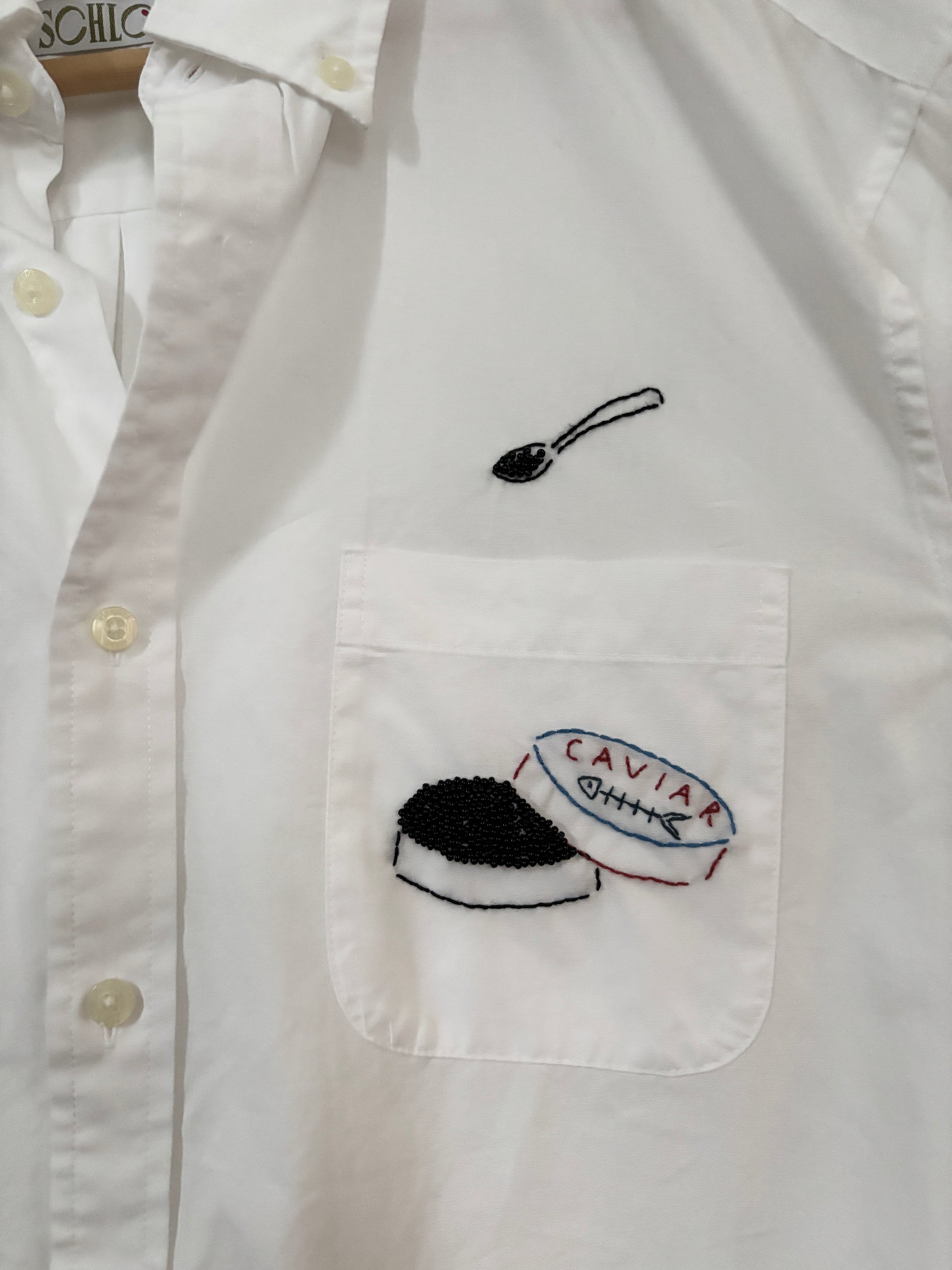 Enjoy the finer things in life with the How Do You Like Your Eggs? Oxford. This garment features hand embroidered and hand beaded caviar tin and caviar spoon. Because getting dressed in the morning should always be a special occasion.